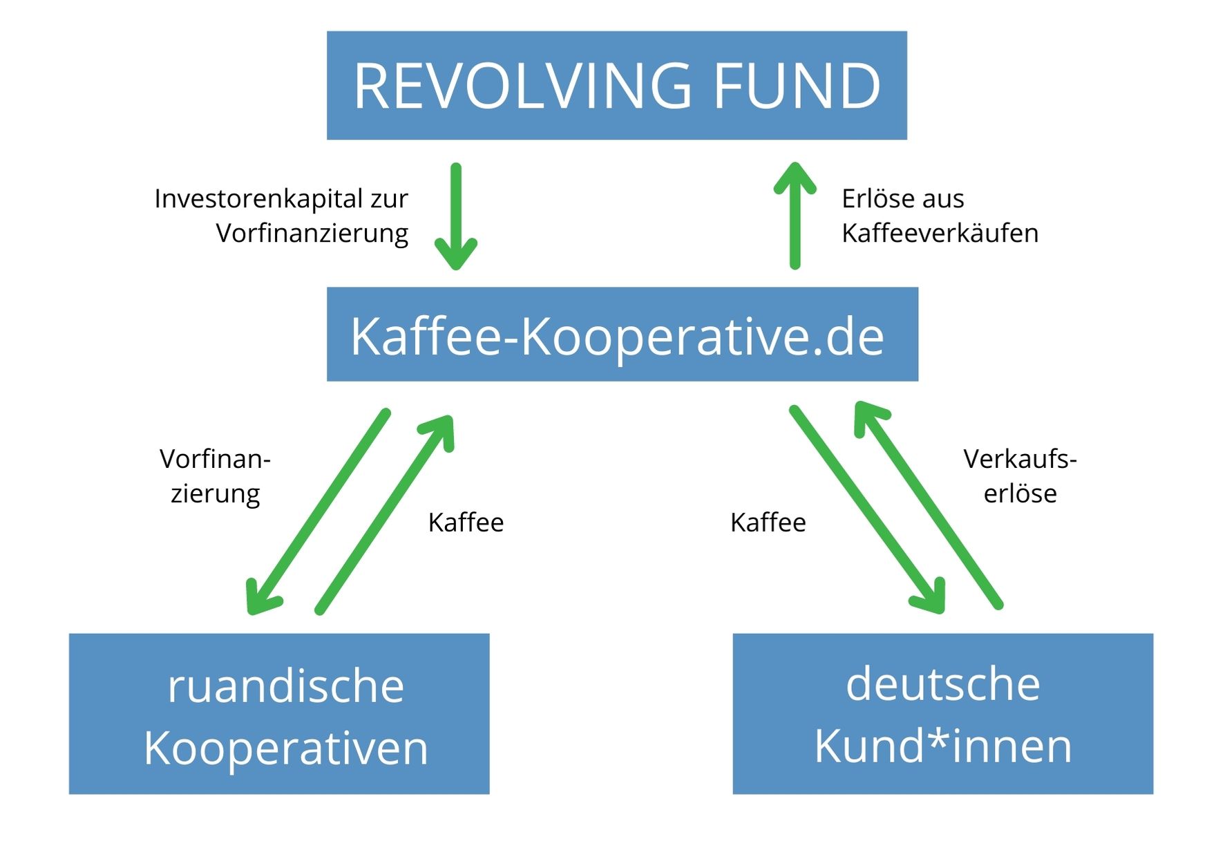 Für die Produktion der Kaffeeernte entstehen jedes Jahr erhebliche Kosten, die die Mitglieder der Kooperativen vorfinanzieren müssen. Dafür müssen Kredite bei ruandischen Banken aufgenommen werden. Hier liegen die Zinsen bei 8 bis 16,6 Prozent. Dieses Problem haben wir gelöst, indem deutsche Investor*innen an die Stelle der Banken mit ihren hohen Zinsforderungen getreten sind. Durch die Einzahlung in den Fund, gewinnen wir Kapital, das wir den Mitgliedern der Kooperative zur Verfügung stellen können. Damit können diese die Produktion des Kaffees vorfinanzieren. Refinanziert wird die Investition samt Zinsen durch die Erlöse aus dem Kaffeeverkauf in Deutschland. Unser Revolving Fund ist inzwischen (Stand 2024) mit 200.000 Euro von 18 Investor*innen ausgestattet, wovon 61% weiblich sind, die zusammen 79% investiert haben.