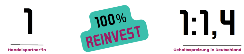 In Deutschland beträgt die Gehaltsspreizung 1:1,4 (d.h. die durchschnittliche Spreizung zwischen dem niedrigstem und höchstem Gehalt innerhalb des Unternehmens in Deutschland). Alle Mitarbeitenden haben jederzeit Einblick in die Gehälter. Als „Social Business im Gewand einer GmbH“ sind unsere Entscheidungsstrukturen formal gemäß der Rechtsform gestaltet. In der Praxis werden Mitarbeitende und Handelspartner*innen jedoch in strategische Entscheidungen einbezogen, ohne formelle Stakeholder*innen-Strukturen.