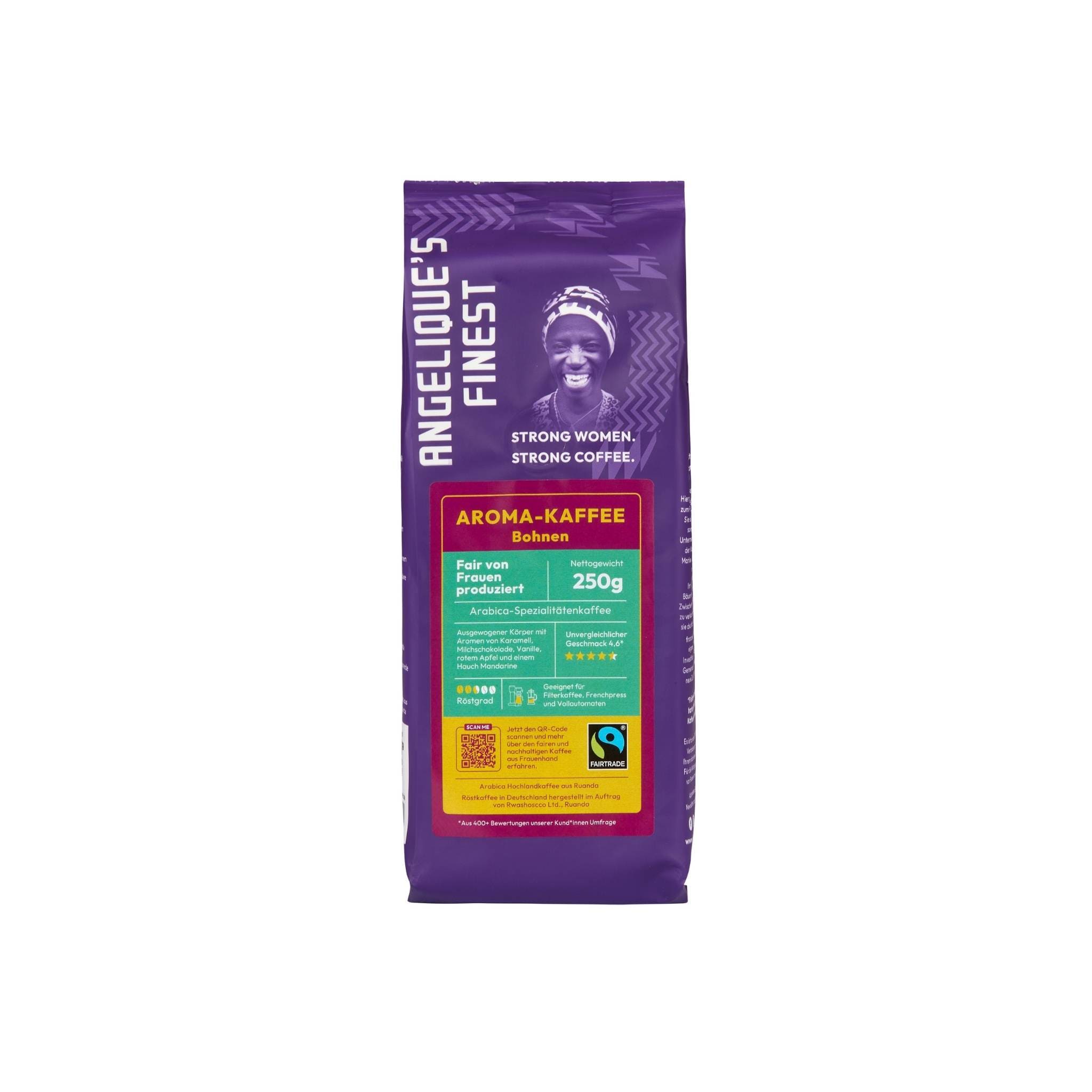 - Angelique’s Finest, Fairtrade Aroma-Kaffee: 100% Arabica-Bohnen aus den Vulkanbergen Ruandas. Ein aromatischer Spezialitätenkaffee, der durch einen ausgewogenen Körper und Säuregehalt mit Aromen von Karamell, Milchschokolade, Vanille, rotem Apfel und einem Hauch Mandarine überzeugt. Perfekt für Filter, Vollautomaten, Frenchpress (die mit dem Drücker) und auch in Espressomaschinen ein Genuss.